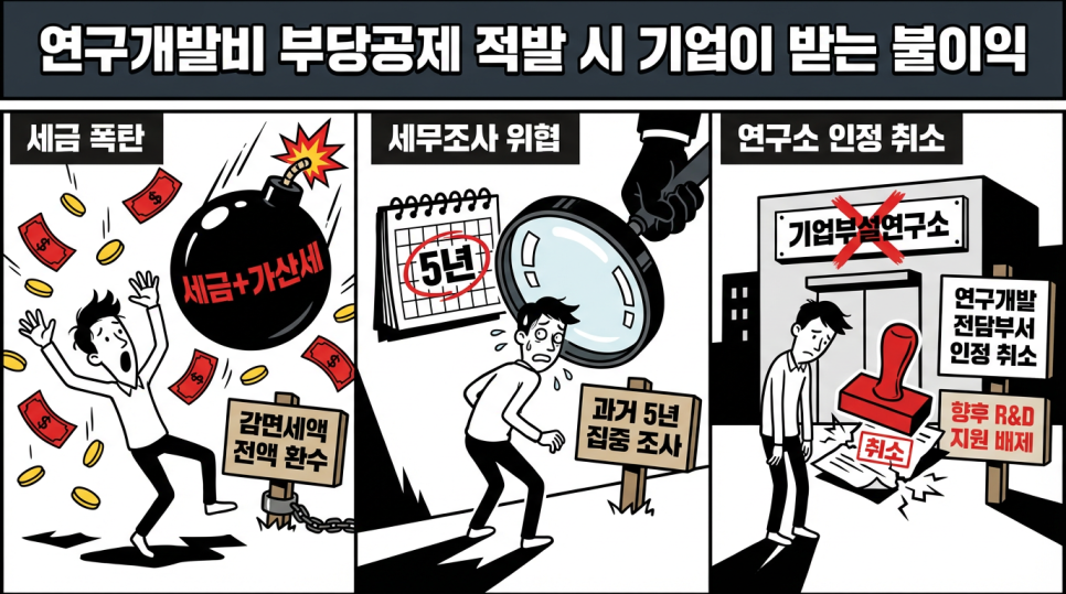 - 추가 세무조사 위협 : 적발시점 기준 과거 5년분 및 향후 연구개발비 공제내역 집중 조사